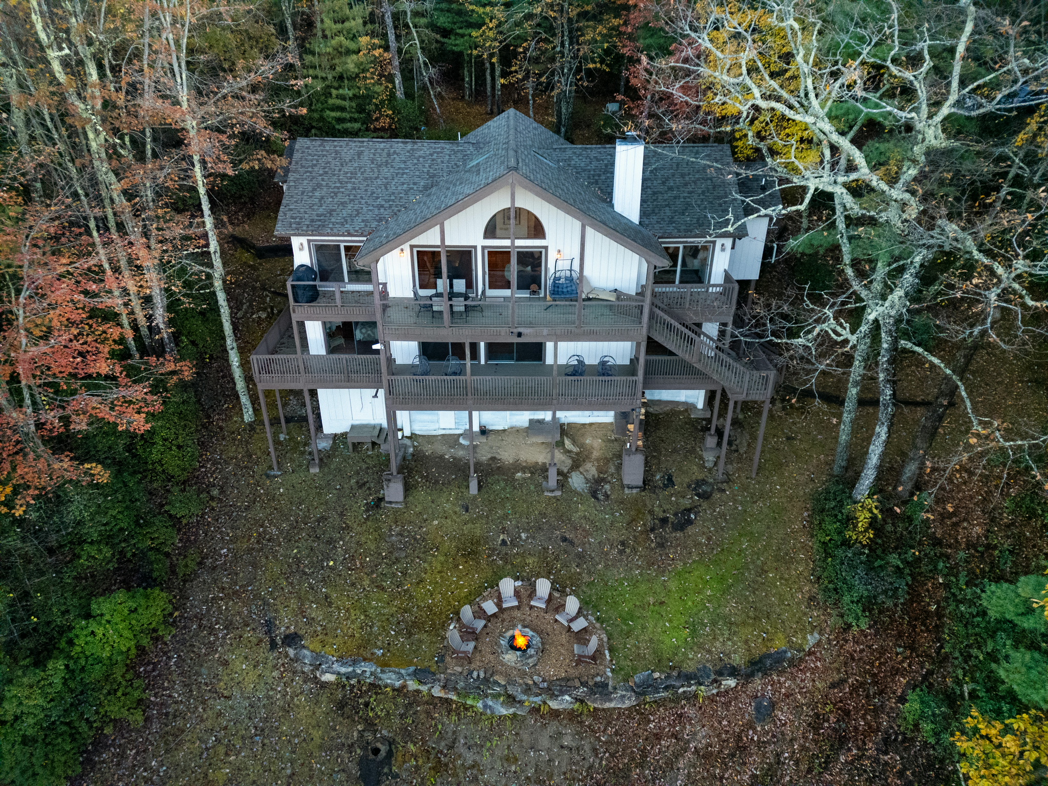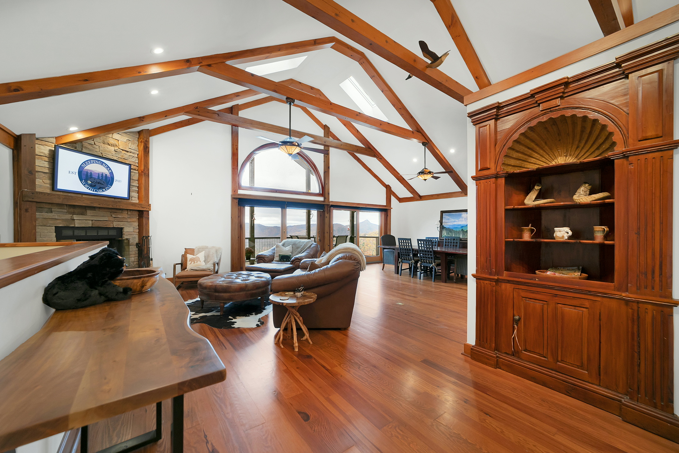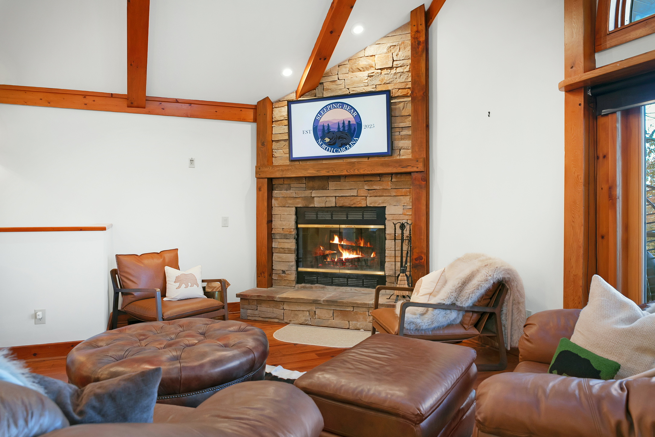 Step inside Sleeping Bear and let your imagination wander through the treetops. From the soaring vaulted ceilings and the stone fireplace that anchors our gathering space to the expansive wrap-around decks facing Whiteside Mountain, every corner is designed to bring the outside in.